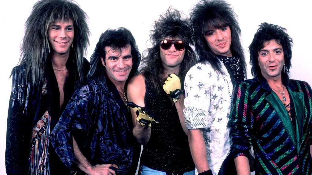 1987 में इलिनोइस में प्रदर्शन से पहले अमेरिकी रॉक बैंड बॉन जोवी। (बाएं से) डेविड ब्रायन, टिको टोरेस, जॉन बॉन